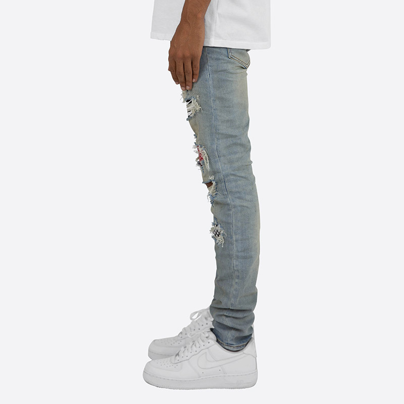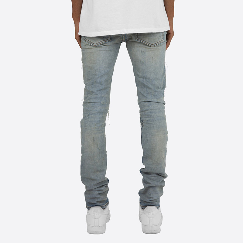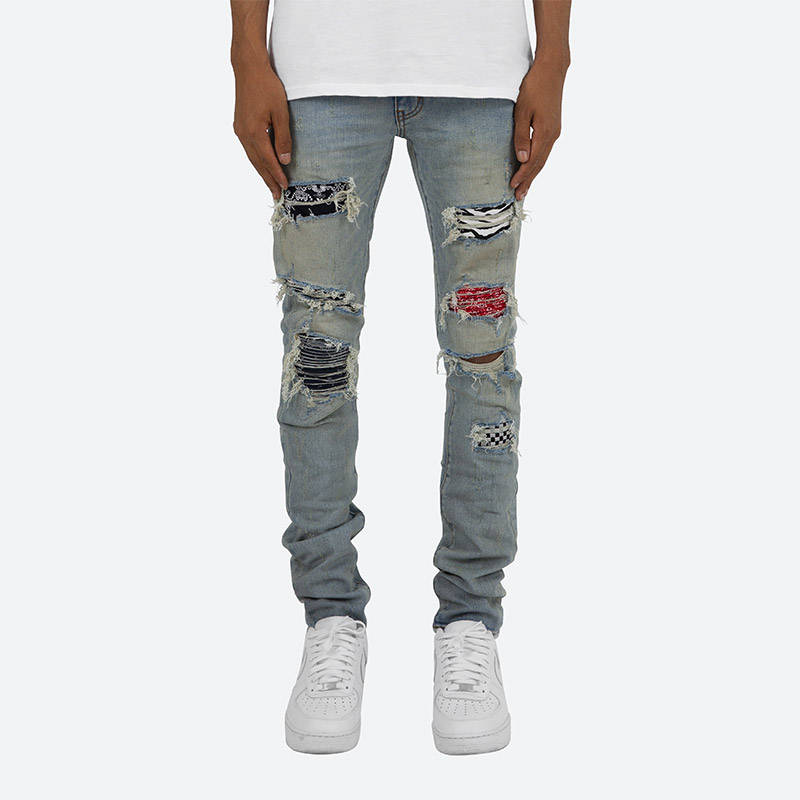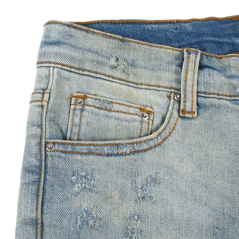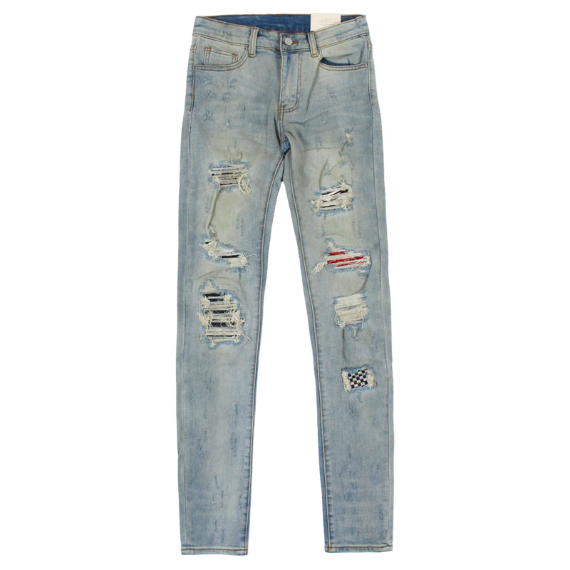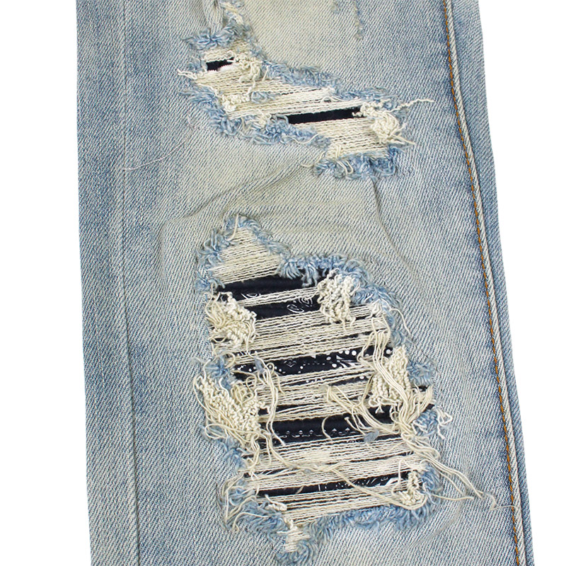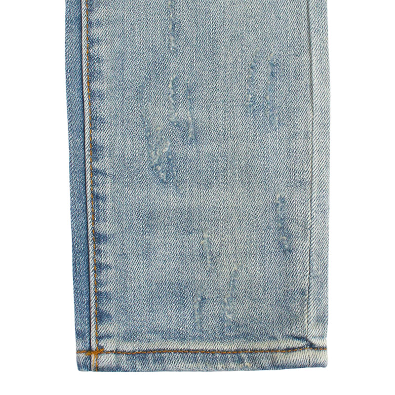 全体的にダメージ加工とウォッシュ加工を施しライトブルーな仕上がりの一本。膝や太もも部分にはペイズリーやゼブラ柄の生地でリペアを施しアクセントに。スーパースリムなシルエットでストレッチが効いているので穿き心地も抜群。股下が長いスタックスキニースタイル。ハイセンスなヴィンテージ加工が施されたストリートスタイルにマストなアイテム。