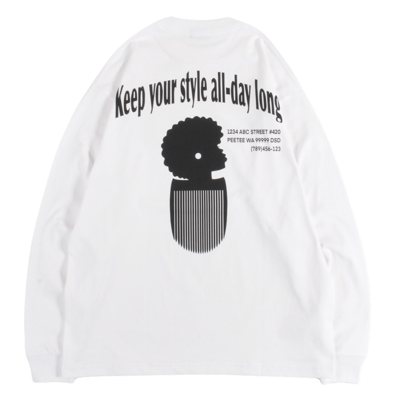 PUSHIMデザインのアフロガールのコームデザインをオンしたロンTEE。ドライタッチでシャリ感のある無骨な雰囲気の7.1オンスのヘビーウェイトの生地を使用したベーシックな一枚。洗いこむほどに粗野感が強まり、縮みや型崩れの少ないアメリカンライクな生地が特徴的。ややドロップショルダー気味に仕上げたシルエットがリラックスして着用できるユニセックスでオススメのアイテムです。