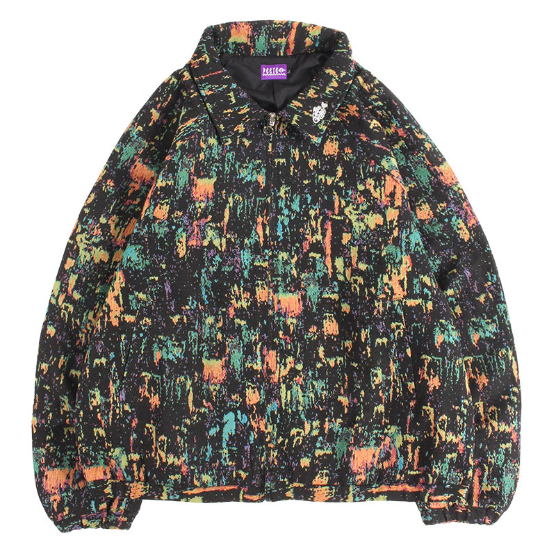 ペンキを飛ばしたような総柄のゴブラン生地が特徴的なジップアップブルゾン。