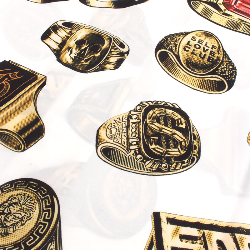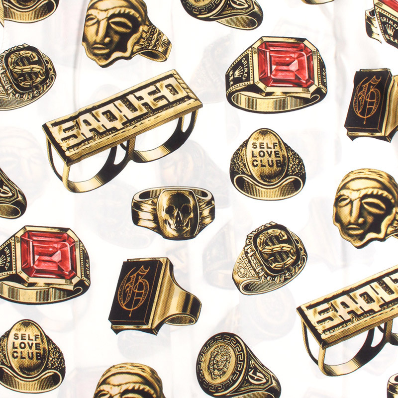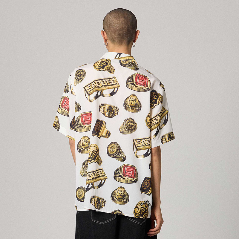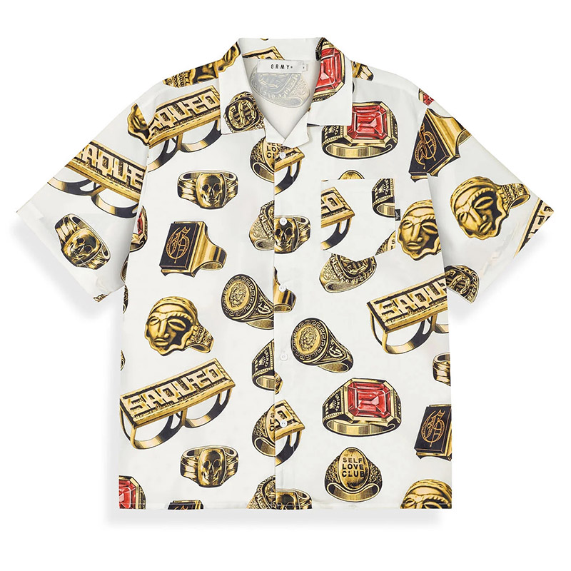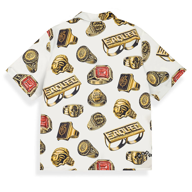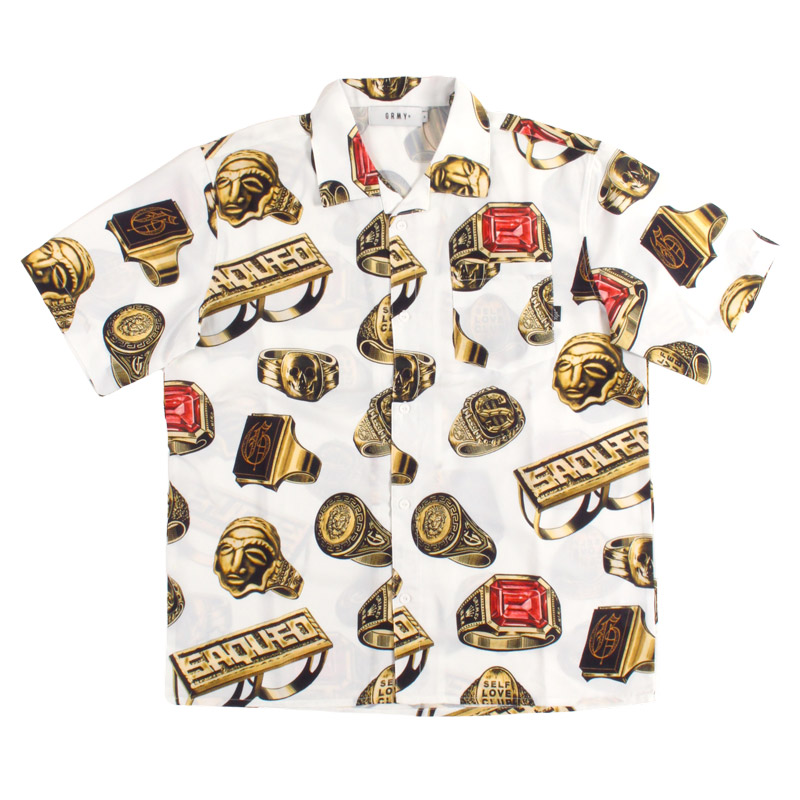 ラグジュアリーな雰囲気のゴールドリングを全面に配した総柄デザインのオープンカラーシャツ。「SAQUEO」の文字が刻まれたナックルダスターやスカルリングなど、GRIMEYらしい遊び心満載の毒のあるモチーフが、白地のボディに鮮やかに映えるアイテム。リラックス感のあるボックスシルエットにさらりとした質感でサマーシーズンも快適に。シンプルになりがちな夏のコーディネートを一気に格上げしてくれる一着です。同デザインのショーツとのセットアップコーデもおすすめです。