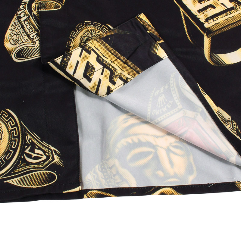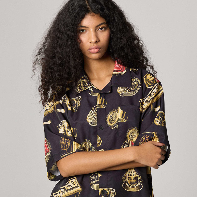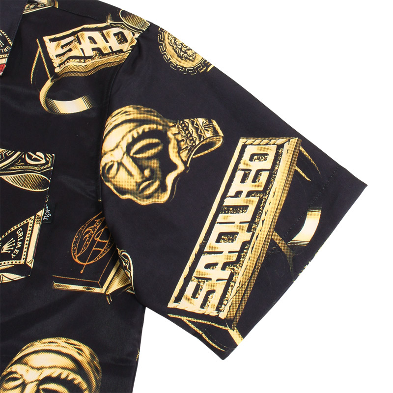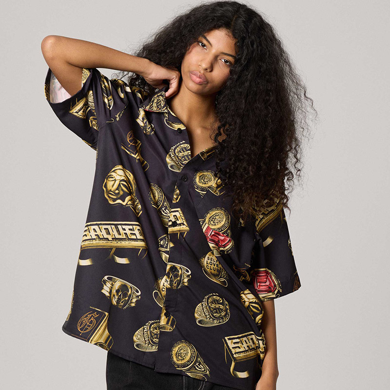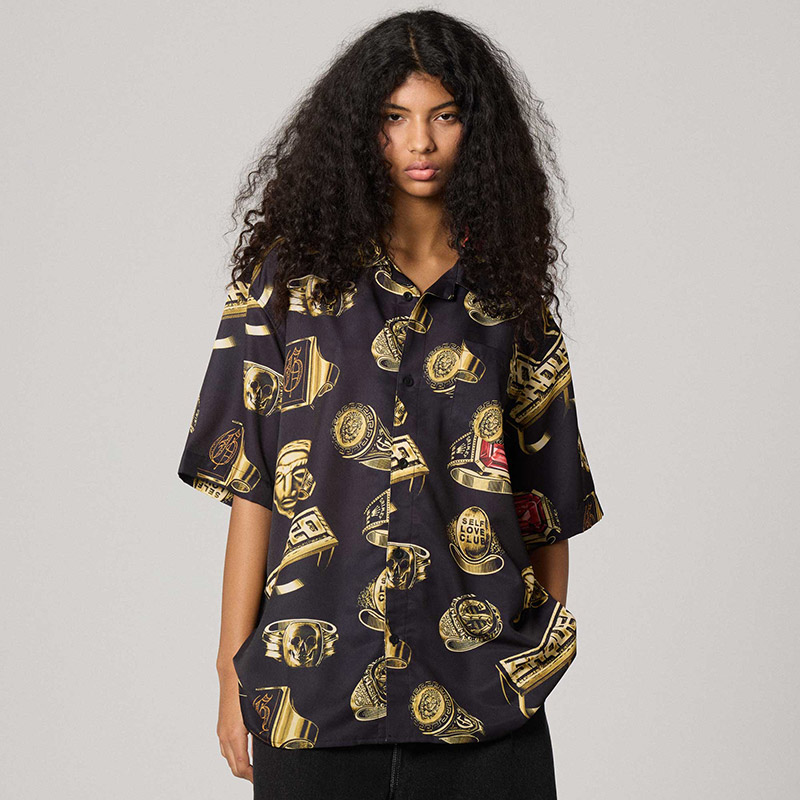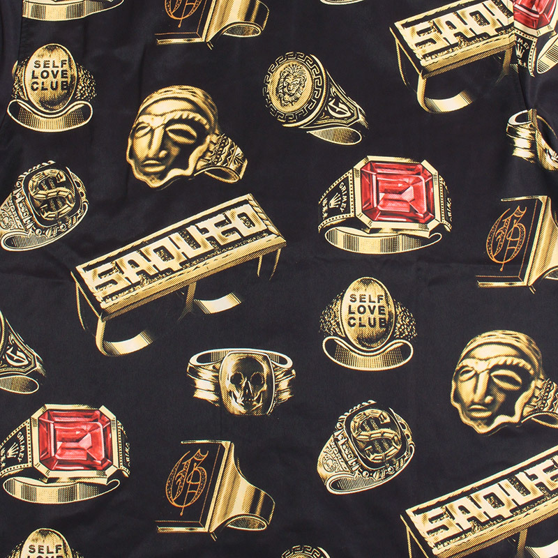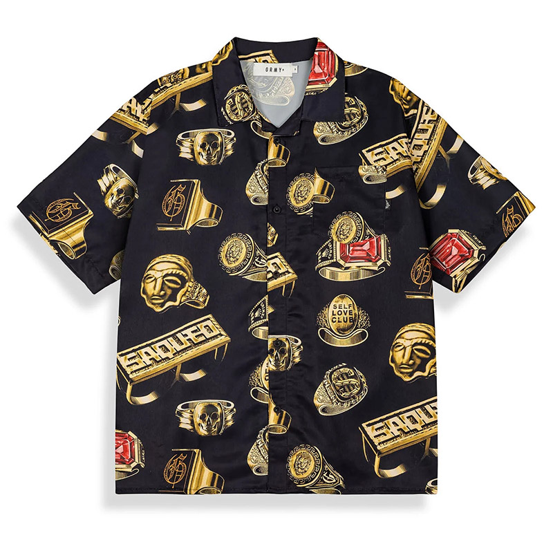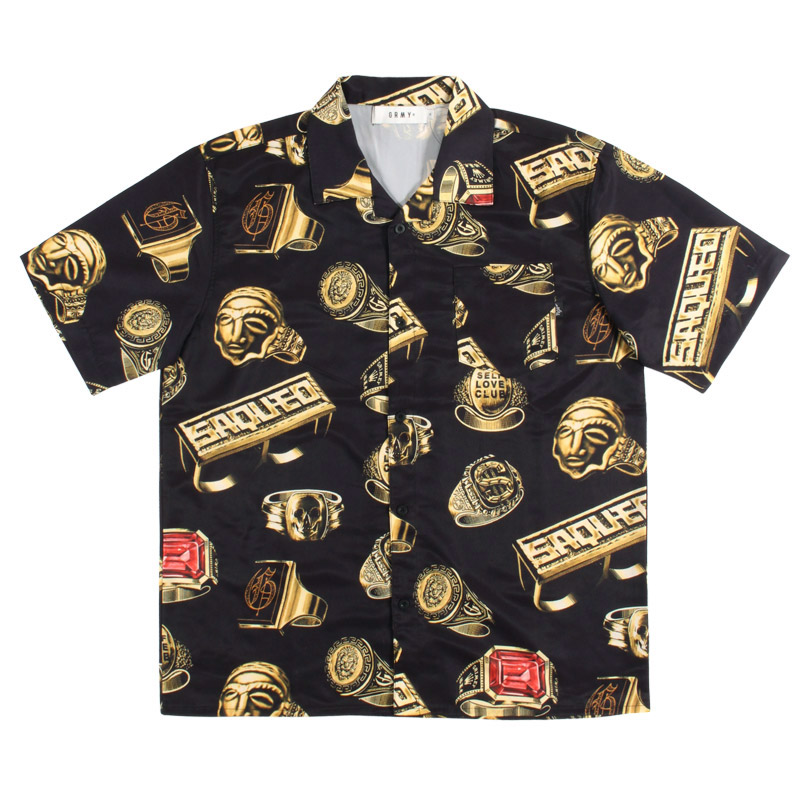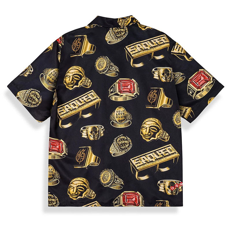 ラグジュアリーな雰囲気のゴールドリングを全面に配した総柄デザインのオープンカラーシャツ。「SAQUEO」の文字が刻まれたナックルダスターやスカルリングなど、GRIMEYらしい遊び心満載の毒のあるモチーフが、黒地のボディに鮮やかに映えるアイテム。リラックス感のあるボックスシルエットにさらりとした質感でサマーシーズンも快適に。シンプルになりがちな夏のコーディネートを一気に格上げしてくれる一着です。同デザインのショーツとのセットアップコーデもおすすめです。