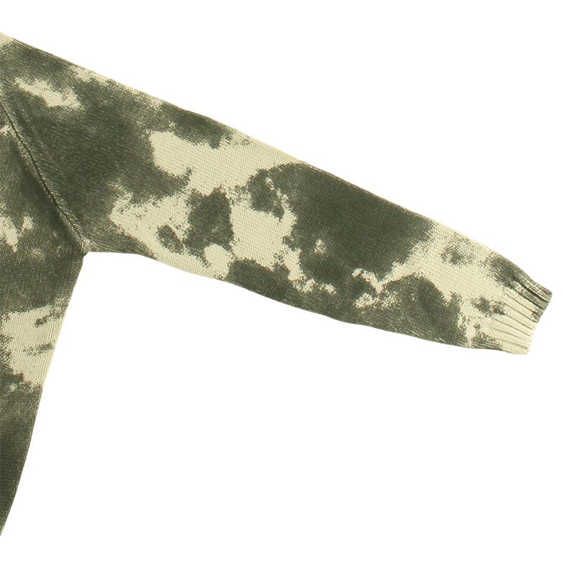 タイダイ染のような独特のムラ感をプリントで表現したラグランスリーブ仕様のクルーネックニット。編み地の風合いを活かしつつ、複雑な染めに見えるように計算されたプリントが目を引く一着。ヴィンテージライクな雰囲気に、ニット特有の柔らかさとストリートの無骨さをミックスしました。ラグラン仕様の程よいルーズシルエットで、春先や秋口のメインとしてはもちろん、インナー使いでも存在感を発揮するユニセックスでオススメのアイテムです。