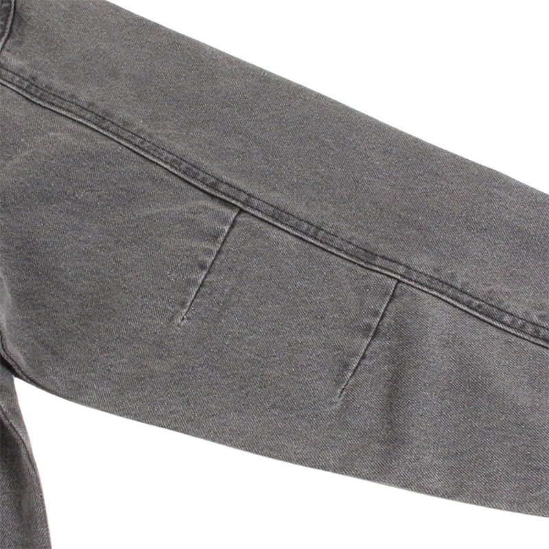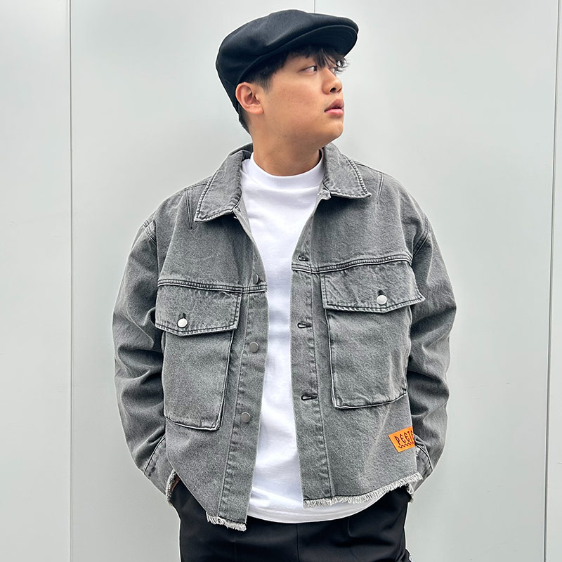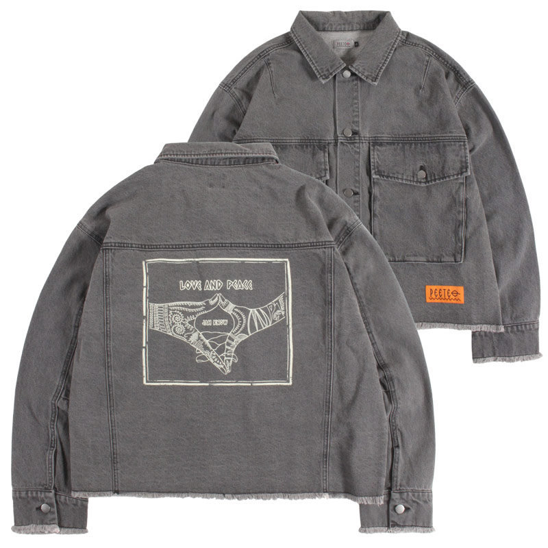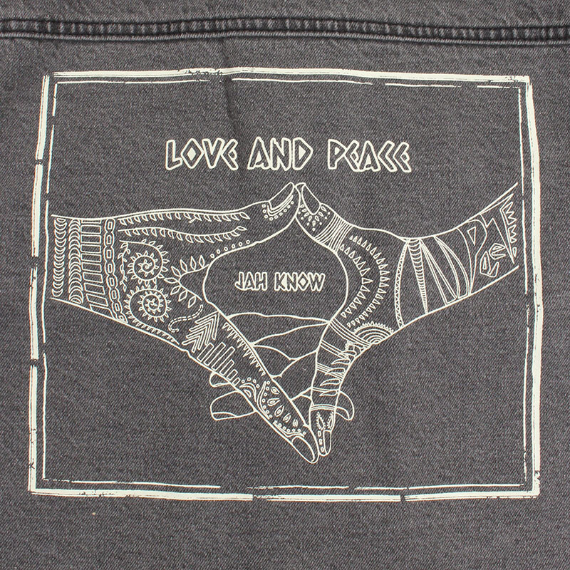 JAHを讃えるラブアンドピースでラスタなハンドサインをバックにデザインしたデニムジャケット。フロントに大きめのフラップポケットを配置したデザイン性が魅力。ヴィンテージライクな加工とエッジの効いたデザインが目を引く一着。長年着込んだようなたまらない色味と古着感をリアルに再現。袖口と裾を大胆にカットオフしたフリンジ仕様と「LOVE AND PEACE」グラフィックが、ボヘミアンかつストリートな雰囲気を醸し出しています。肩を落としたドロップショルダーと広めの身幅で、リラックスした着心地です。計算されたショート丈×ワイドシルエットが、トレンド感あるスタイルを完成させるユニセックスでオススメの一着。「ただのデニムジャケットじゃ物足りない」そんな方に手にとってほしい、ディテールにこだわったアイテムです。