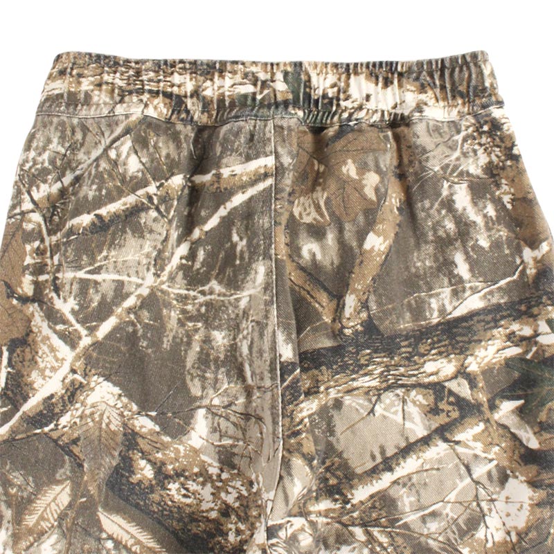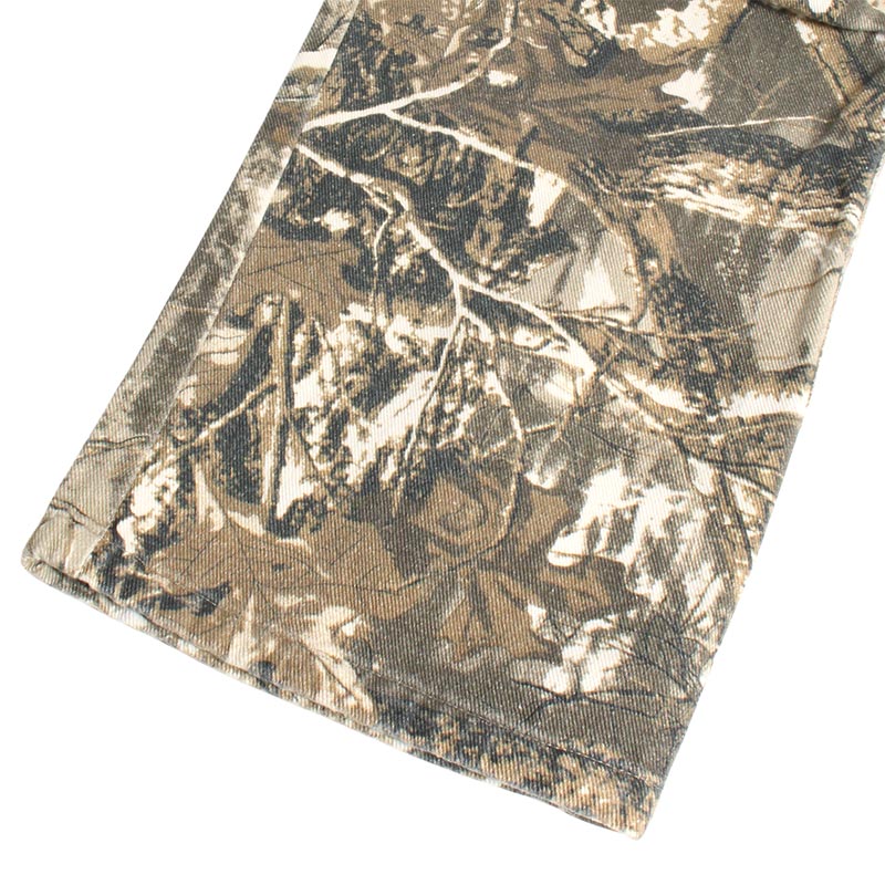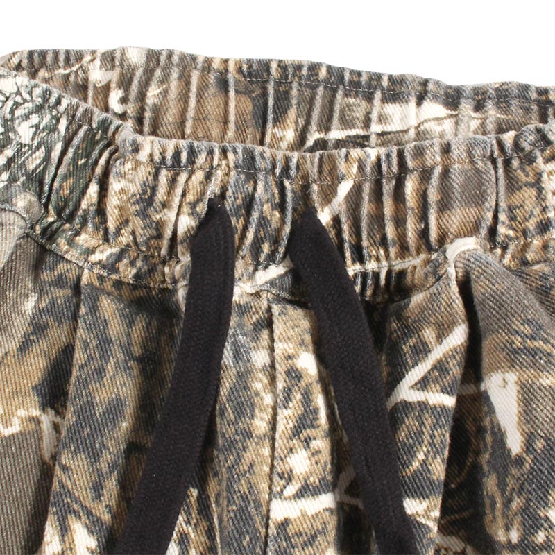 ミリタリーな雰囲気のリアルツリーカモを全面に配したワイドシルエットパンツ。