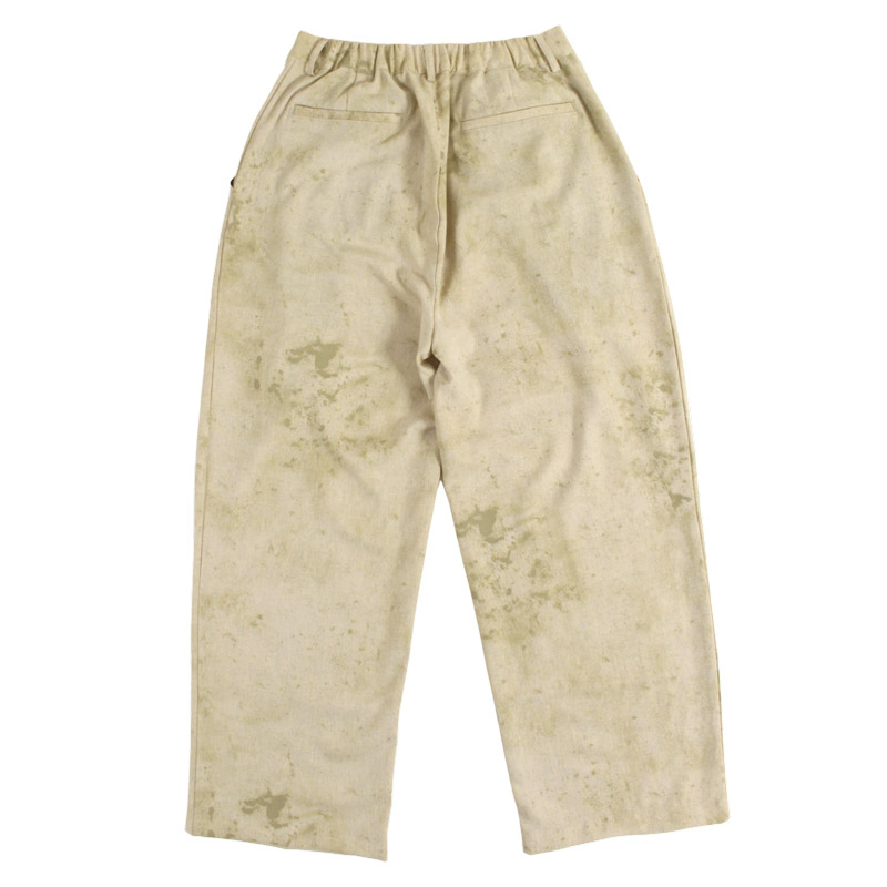 ヴィンテージな風合いのフェード感のあるダメージデザインをジャガード織りで表現したスラックス。股上を深く確保し、裾に向かって緩やかにテーパードする現代的なルーズでワイドなシルエットが魅力。ポリエステル主体にポリウレタンをブレンドした生地はシワになりにくいのが特徴。深く取られたタックやイージー仕様のバックシャーリング、ゆったりとしたヒップ周り、すっきりとした裾回りでリラックスした穿き心地の一本。きれいめからカジュアル、ストリートスタイルと幅広く着用可能なユニセックスでオススメのアイテム。同素材を使用したダブルジャケットとのセットアップコーデもおすすめです。