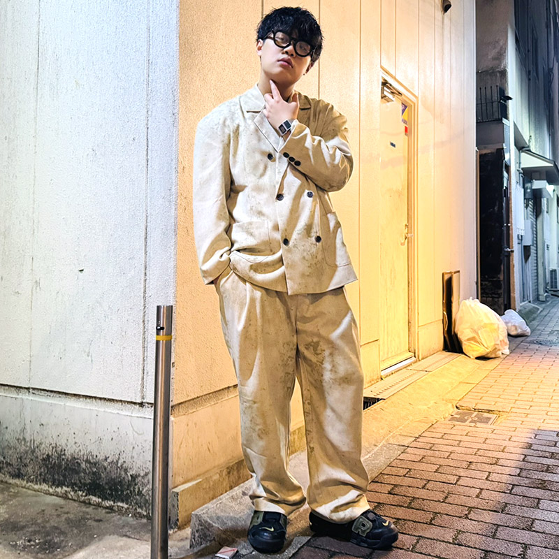 ヴィンテージな風合いのフェード感のあるダメージデザインをジャガード織りで表現したラフに着こなせる、ゆとりのあるテーラードジャケット。ポリエステル主体にポリウレタンをブレンドした生地はシワになりにくいのが特徴。きれいめからカジュアル、ストリートスタイルと幅広く着用可能なユニセックスでオススメのアイテム。同素材を使用したスラックスパンツとのセットアップコーデもおすすめです。