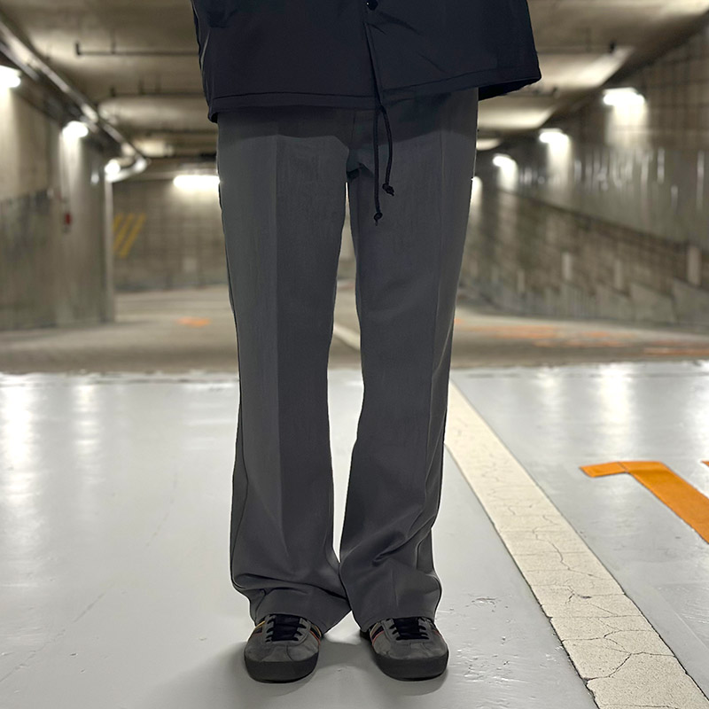 往年のカウボーイパンツをベースに、現代的な解釈を加えた一本。ポリエステルを混紡した生地を使用し、シワになりにくく、スタプレのようなセンタープレスのキープ力と、上品な微光沢が特徴です。シルエットは、膝下からわずかに広がる絶妙なセミブーツカット。脚を長く、細く見せる視覚効果は抜群です。最大の特徴は、見た目の端正さに反したストレッチ性。細身ながらも動きを妨げず、カジュアルやキレイめスタイルにデイリーユースで大活躍するユニセックスでオススメのアイテムです。