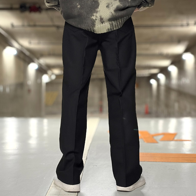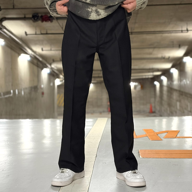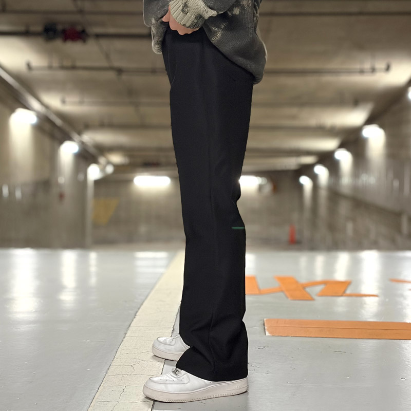 往年のカウボーイパンツをベースに、現代的な解釈を加えた一本。ポリエステルを混紡した生地を使用し、シワになりにくく、スタプレのようなセンタープレスのキープ力と、上品な微光沢が特徴です。シルエットは、膝下からわずかに広がる絶妙なセミブーツカット。脚を長く、細く見せる視覚効果は抜群です。最大の特徴は、見た目の端正さに反したストレッチ性。細身ながらも動きを妨げず、カジュアルやキレイめスタイルにデイリーユースで大活躍するユニセックスでオススメのアイテムです。