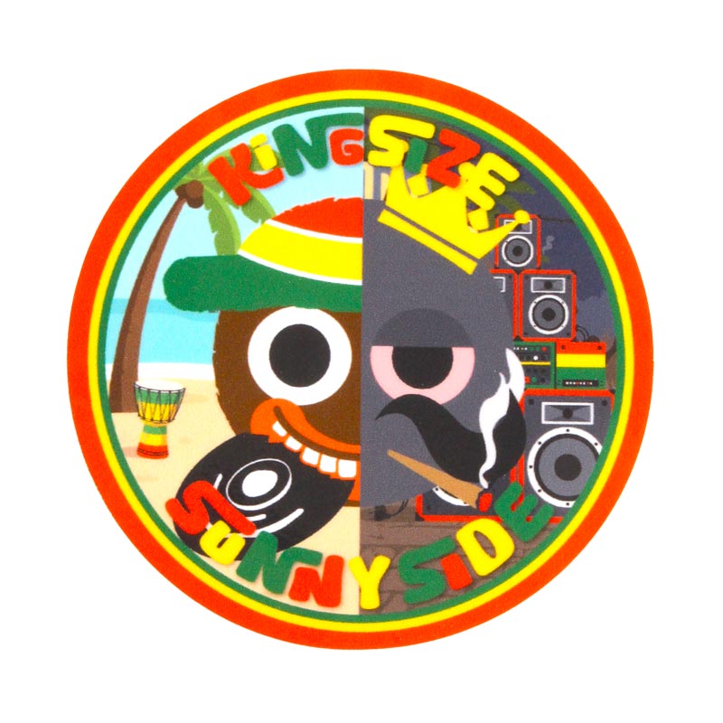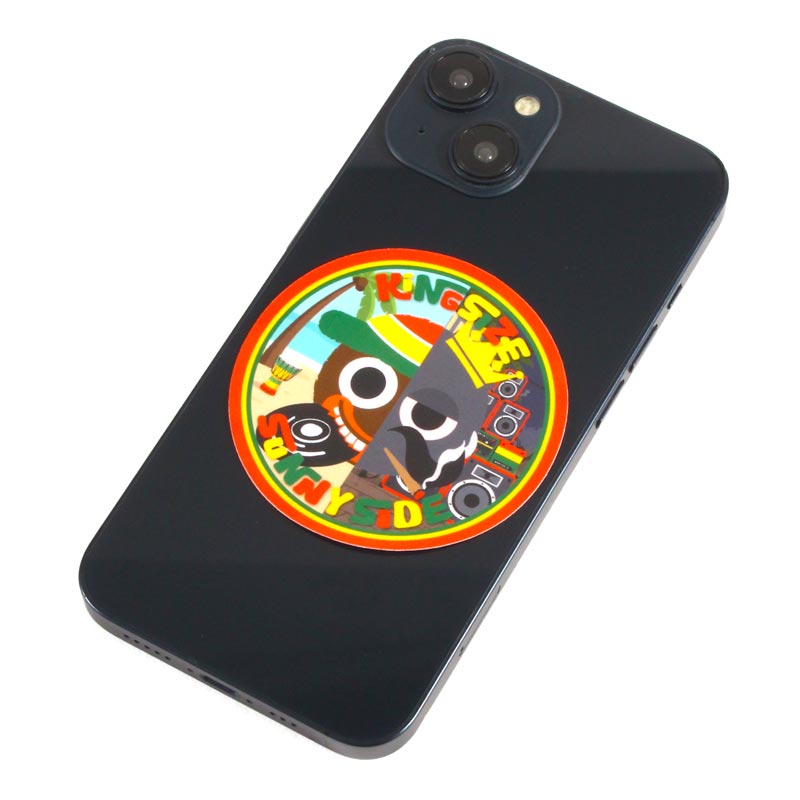 レゲエ・プロダクション<SUNNY SIDE RECORDS>の顔ともいえるキャラクターをベースに、<KINGSIZE>のマインドを大胆に落とし込んだ、「ラガマフィン」なステッカー。両ブランドのアイデンティティをマッシュアップしたグラフィックデザインに仕上がっています。ビーチで聴く心地よいリズムと、重低音が響くスピーカーの壁。そんな音楽好きのライフスタイルを象徴するキャラクターが融合した限定デザインです。円形の中に凝縮された「KINGSIZE」の王冠と「SUNNY SIDE」のトロピカルな空気感。このステッカー1枚で、あなたのギアを独自のスタイルへアップデート。耐水性に優れたウォータープルーフ素材を採用。スマホに貼れるサイズ感がうれしいアイテム。