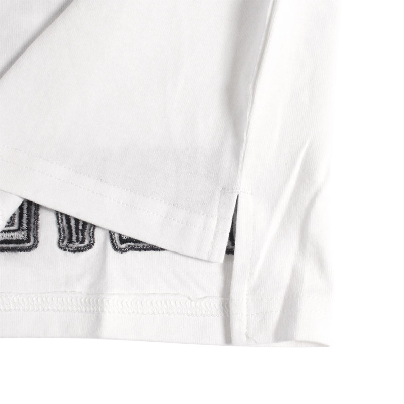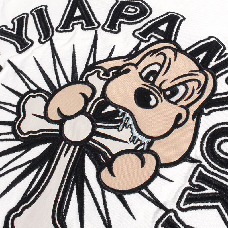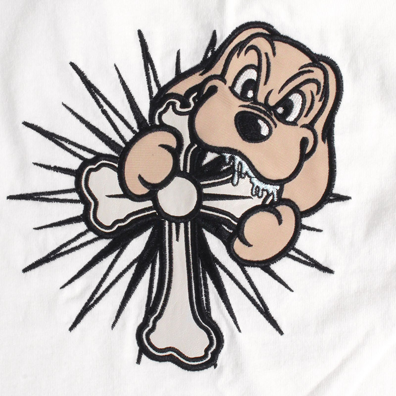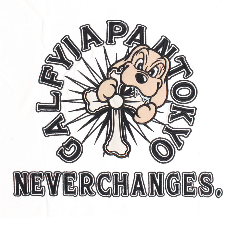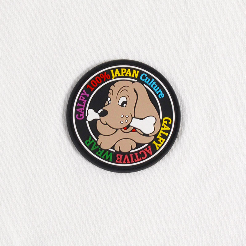 お馴染みのワンちゃんが、クロス型の骨をワイルドに咥えた「おしゃぶりワンワン」デザイン。フロントの胸元にはワンポイントで、バックには腰位置に大胆なサークルロゴと共に配置されています。GALFYらしい「コワ可愛い」絶妙なニュアンスが魅力です。プリントではなく、立体感のあるアップリケ刺繍を採用。キャラクター部分やロゴの縁取りなど、細部まで丁寧に作り込まれており、タフな使用にも耐える重厚感とクオリティを演出します。程よいドロップショルダーと、ゆとりを持たせた身幅が特徴でストリートスタイルには欠かせないルーズなサイジングが、一枚で着てもサマになり、レイヤードスタイルにも最適です。女性にもおすすめのユニセックスアイテムになります。