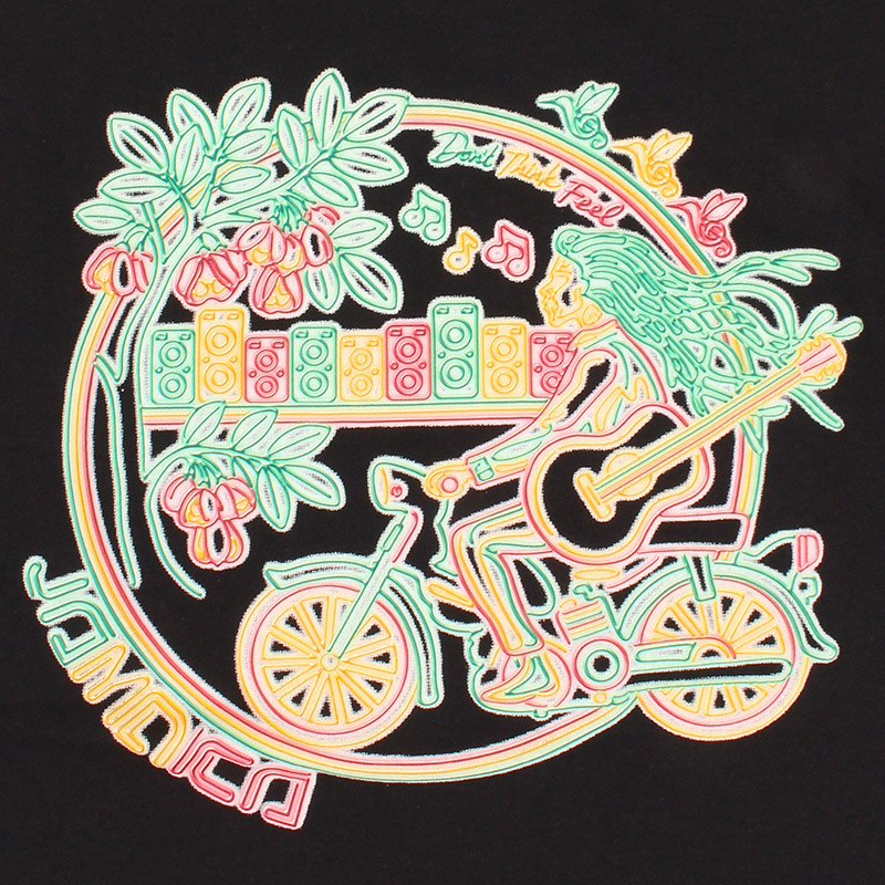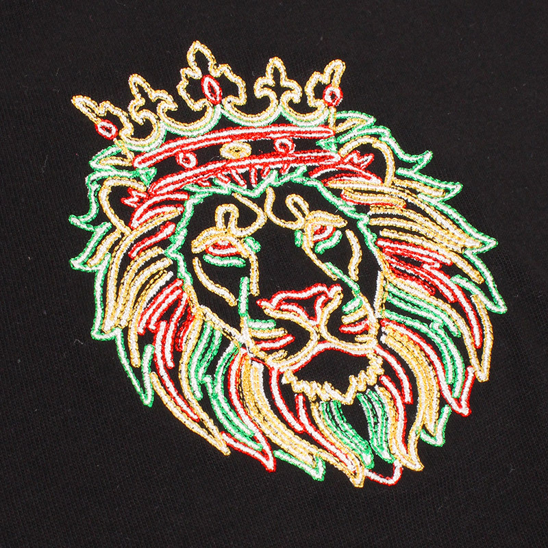 バックには、バイクに跨るギタリストやサウンドシステムなど、レゲエカルチャーを象徴するモチーフをラスタカラーのネオンアート風にレイアウトしました。ジャマイカの日常を切り取ったようなノスタルジックな風景を凹凸感のある発泡プリントで仕上げた存在感あるアイテム。フロントのライオンロゴは、繊細なステッチでネオンの質感を再現した贅沢な仕上がり。ブランドの象徴であるロゴをラスタカラーで刺繍しました。ゆったりとしたトレンド感のあるシルエットが、ストリートでの存在感も抜群。ディテールへのこだわりが、シンプルな着こなしに圧倒的な個性をプラスします。ゆったりとしたシルエットにシルキーで肌触りの良い生地感がリラックスして着用できるユニセックスでおすすめの一枚。