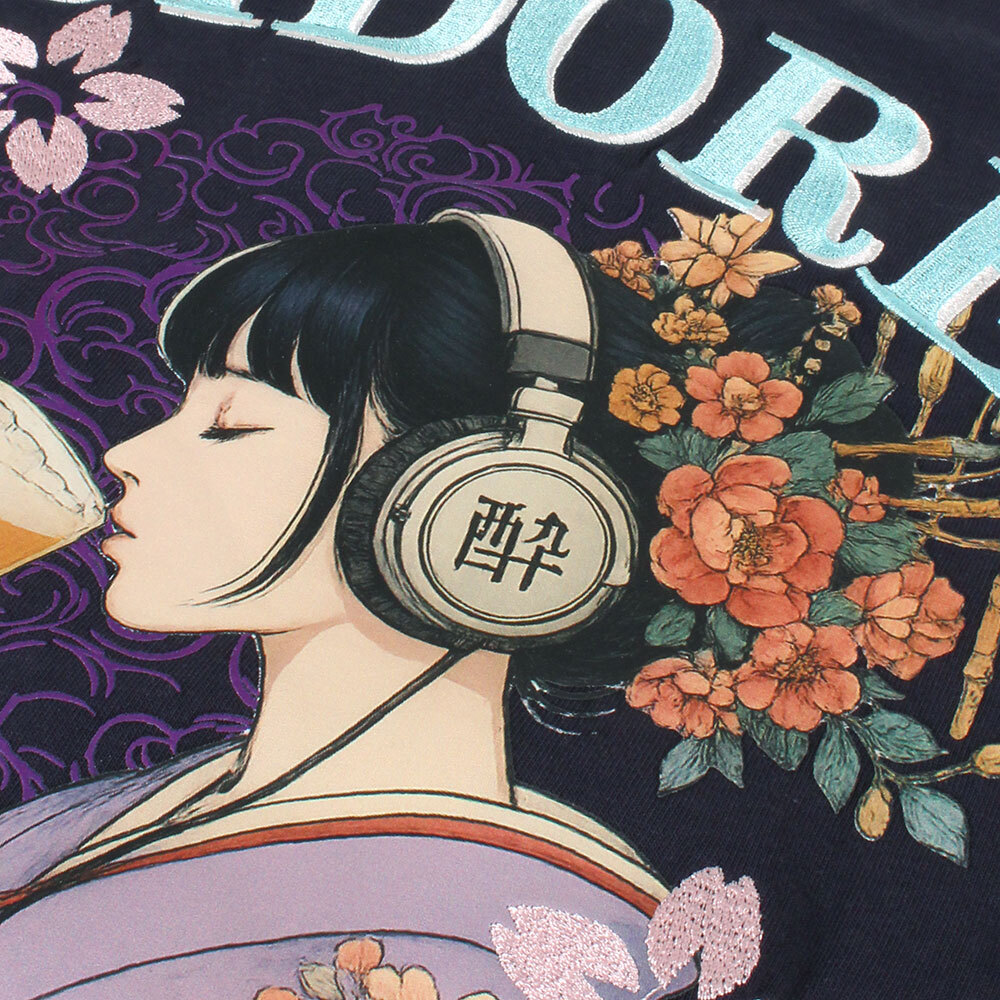 ヘッドホンで音楽に浸りながら喉を鳴らす、粋な着物女子を大胆にプリントしたお酒と音楽を愛するすべての「酒愛好家」に捧げる一枚です。フロントには「Yoidone(よいどれ)」のスクリプトフォントと、お守りモチーフの刺繍をあしらい、ディテールまで遊び心を詰め込みました。プリント+刺繍ミックスのデザインが、プリントだけでは表現できない立体感と上質さをプラスしています。リラックス感のあるゆったりとしたシルエットで、ストリートスタイルに最適なアイテム。シルキーで肌触りの良い生地感がリラックスして着用できるユニセックスでおすすめの一枚。