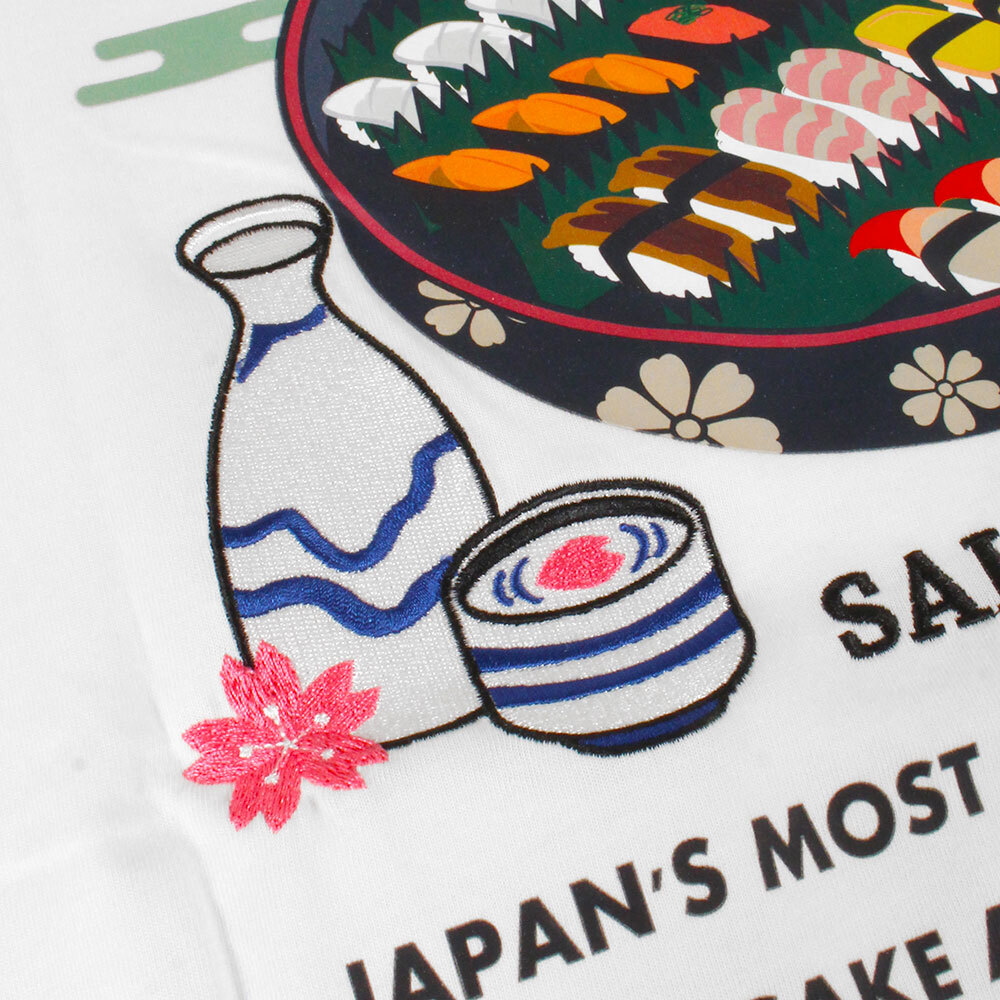 お酒好きに愛されるブランド【YOIDORE】より、日本の粋を詰め込んだTシャツが登場。「美酒佳肴(びしゅかこう)」とは美味しいお酒とそれに合う素晴らしい料理(肴)を意味する言葉。バックに鎮座する豪華な「寿司桶」は、鮮やかなプリントで表現。デザインのアクセントとなる「桜の花」や「徳利とお猪口」「寿司」の文字は、精密な刺繍加工を施しました。プリントの平面的な表現に刺繍の立体感が加わることで、奥行きのある高級感を演出しています。胸元にはお箸に「SUSHI / SAKE」の文字を刺繍、シンプルながらも主張のある一着に。ゆったりとしたシルエットで、ストリートシーンから居酒屋での一杯まで、幅広いシーンで主役を張れるアイテム。これ一着で、日本の夏を粋に楽しめます。シルキーで肌触りの良い生地感がリラックスして着用できるユニセックスでおすすめの一枚。