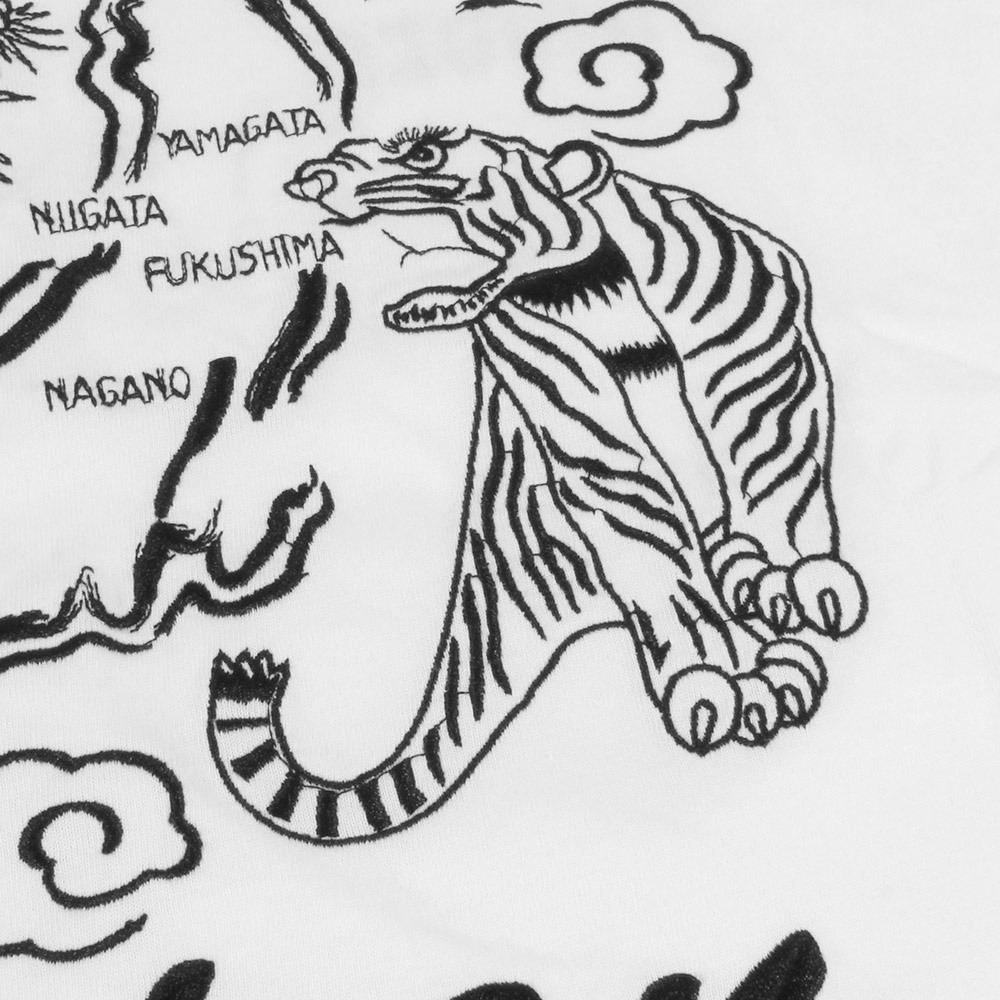 龍と虎、日本を象徴するモチーフをスカジャンライクに落とし込んだTシャツ。フロントには睨み合う「龍」と「虎」、バックには日本地図を背負った圧巻のグラフィックをALL刺繍で表現。刺繍ならではの重厚な立体感が、ホワイトボディに抜群の存在感を放ちます。お酒のボトルを抱えた龍など、ブランドらしい「粋」な遊び心も健在。シルキーで肌触りの良い生地感にゆったりとしたシルエットで、リラックスして着用できるユニセックスでおすすめの一枚。