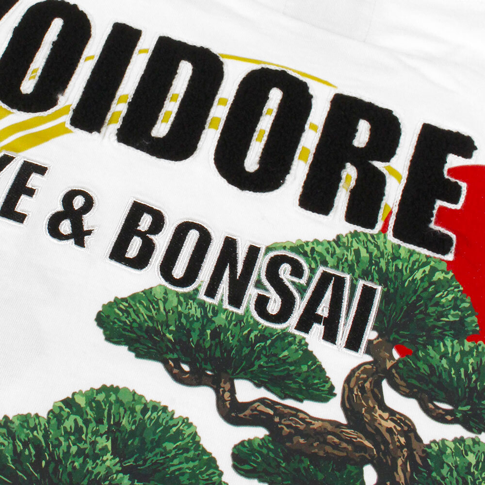 フロントには、コンパクトながら存在感を放つ盆栽の精密な刺繍、バックには、立派な盆栽と日本酒のボトル、静かに昇る赤富士を彷彿とさせる太陽をプリントと刺繍をミックスした贅沢な技法で大胆にデザイン。「美しいものを眺めながら酒を飲む、それが日本のスタイル」という直球なメッセージが、ブランドらしい「酔いどれ」な世界観を体現しています。シルキーで肌触りの良い生地感にゆったりとしたシルエットで、リラックスして着用できるユニセックスでおすすめの一枚。