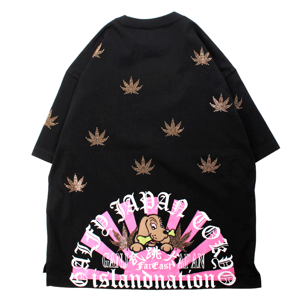 アイコニックなおなじみのワンちゃんを、みどりな骨を咥えた武跳(ぶっとび)な赤目仕様でオン。贅沢に散りばめられたゴールドのガンジャスタッズが光を反射して、ラグジュアリーかつアウトローな雰囲気を演出します。バック裾部分には、燃えるような日章旗グラフィックがフロントのクールな印象に対し、鮮やかなカラーリングでバックスタイルを彩ります。スタッズの輝きと日章旗がクロスオーバーする唯一無二のGALFY流アイランドネイション。程よいドロップショルダーと、ゆとりを持たせた身幅が特徴でストリートスタイルには欠かせないルーズなシルエットが、女性にもおすすめのユニセックスアイテムになります。