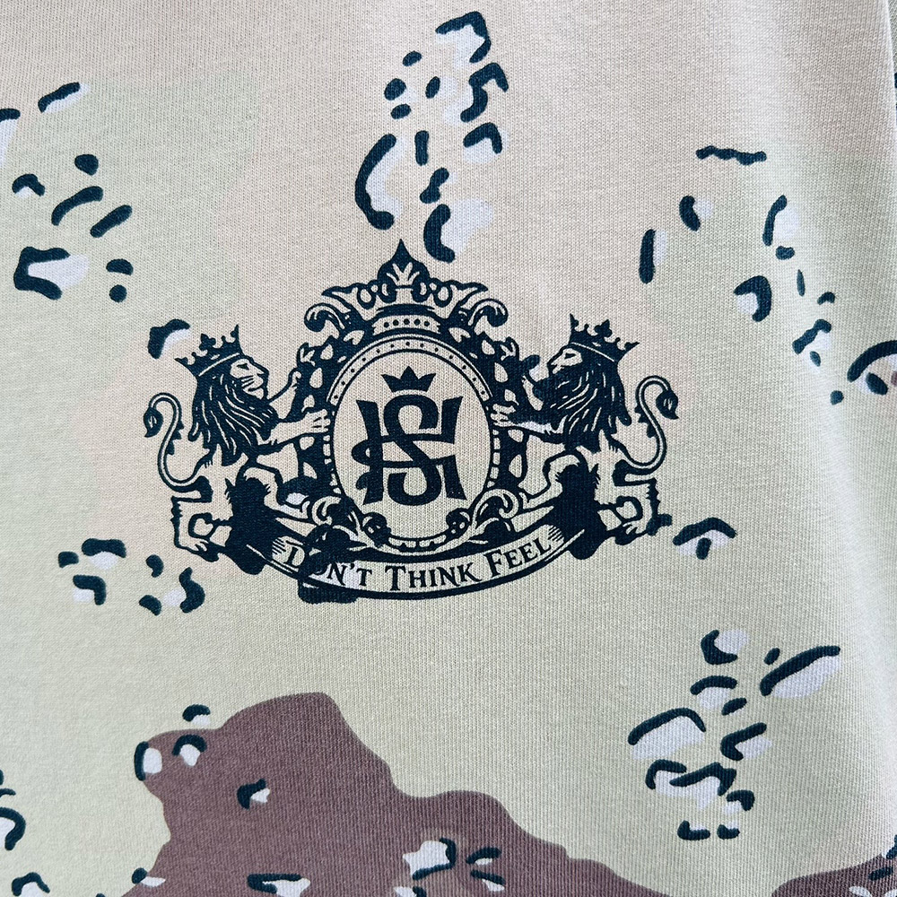 左胸には、重厚感のあるライオンのエンブレムロゴを配置。バックには、ブランドのバックボーンである「REGGAE」「DANCEHALL」のスピリットを、幾多のキーワードと共に配したオリジナルカモTシャツ。7.5オンスのヘビーウェイトの生地を使用したボックスシルエットがトレンド感のある仕上がり。厚手でタフな質感ながら、ウォッシュ加工を施した肌馴染みの良い着心地が魅力です。