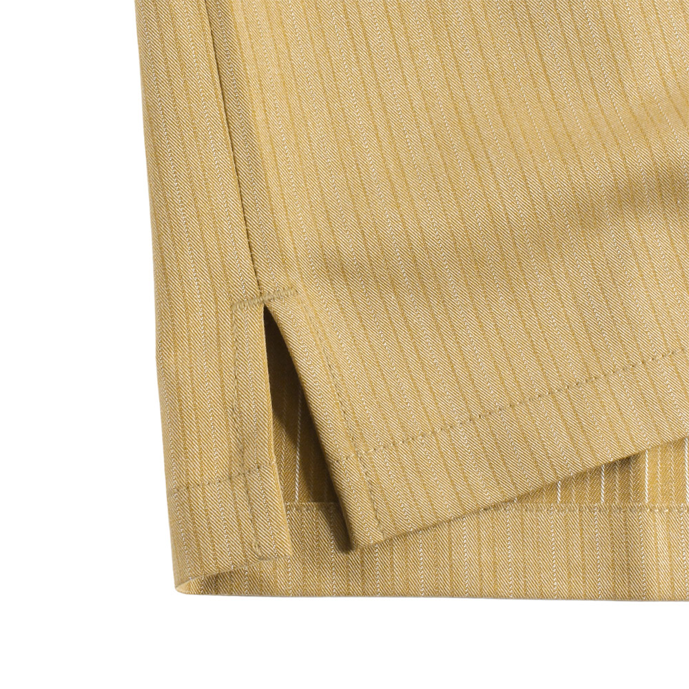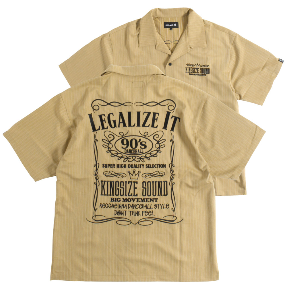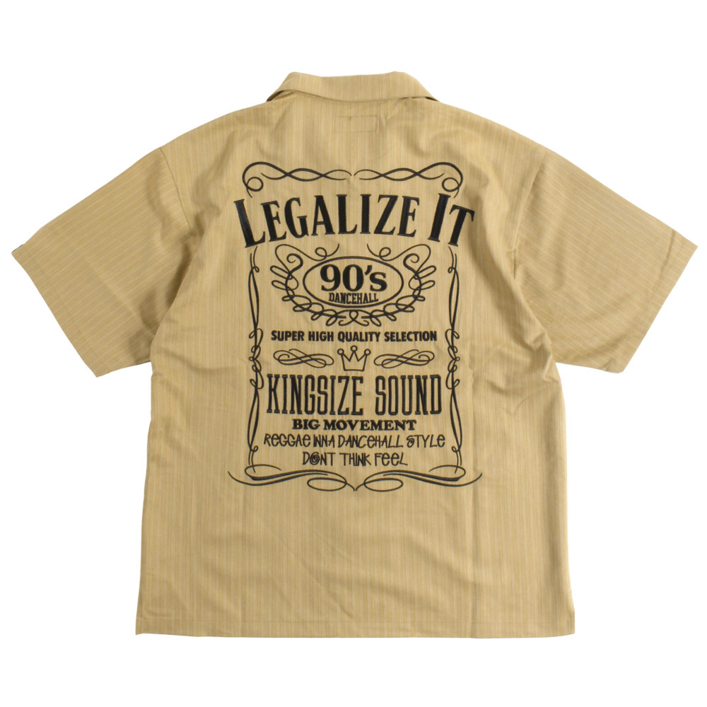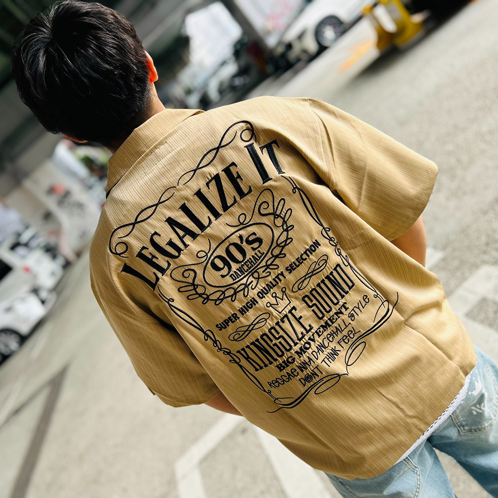 バックに90'sダンスホールカルチャーへのリスペクトを込めた「LEGALIZE IT」の力強いメッセージを配したグラフィックを高品質な刺繍で表現したオープンカラーシャツ。ポリエステルベースにレーヨンを混紡した、程よく光沢感のあるストライプ生地は、レーヨン特有のドレープ感を持ちながら、ポリエステルとポリウレタンをブレンドすることで「シワになりにくさ」と「動きやすさ」を両立し汗をかく季節でもクリーンな印象をキープできるのが嬉しいポイント。サイドスリットを配したゆとりのあるボックスシルエットがストレスフリーな着心地とトレンド感のある着こなしを演出します。ラフに羽織ってもサマになる、シンプルベーシックな仕上がりで、この夏ヘビロテ確定の主役級アイテムです。デニムやチノパンツなどとも相性が良く、デイリーユースからリラックススタイルまで幅広いコーディネートに対応するユニセックスでオススメのアイテムです。