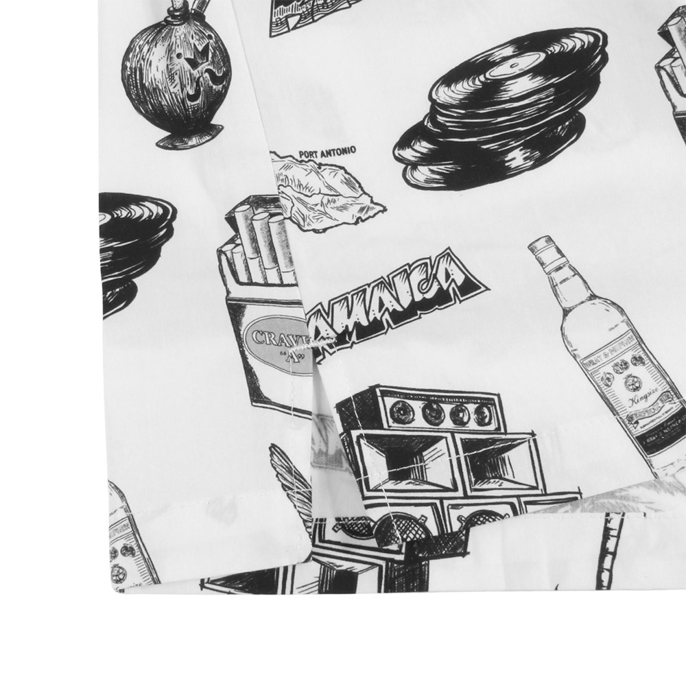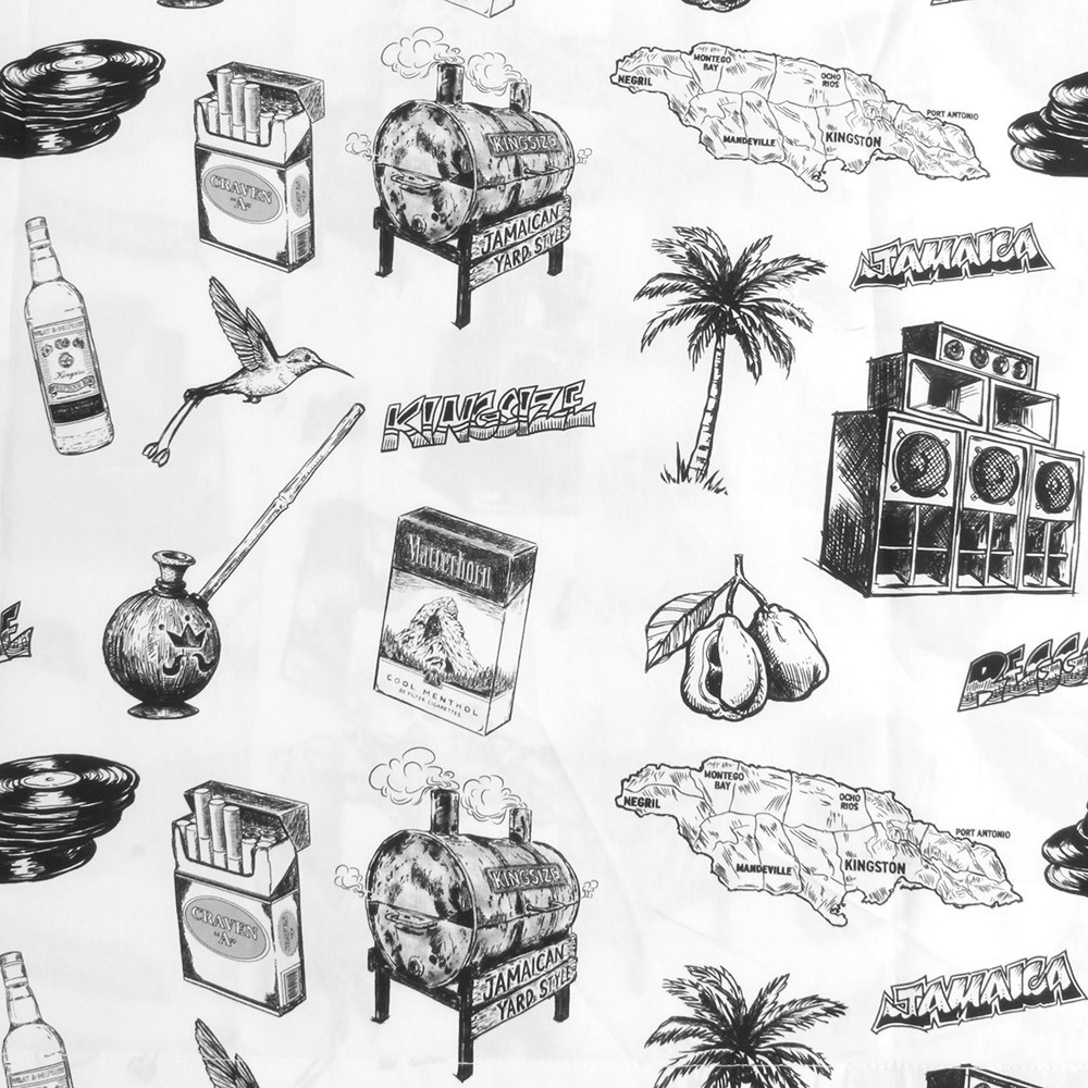 ジャマイカの空気感をそのまま詰め込んだオープンカラーシャツが登場。サウンドシステム、レコード、ジャークパン、タバコパッケージなど、レゲエカルチャーを象徴するアイコンを贅沢に総柄で配しました。素材には肌馴染みの良い綿100%を採用し、サイドスリット入りのボックスシルエットが、リラックス感のある大人のストリートスタイルを演出します。ブランドのバックボーンを存分に感じられる、春夏シーズンにマストな一着です。ホワイトボディにモノトーンのグラフィックスがクリーンな印象で、デニムやチノパンツなど好相性で着回ししやすく、デイリーユースで大活躍するユニセックスでオススメのアイテムです。