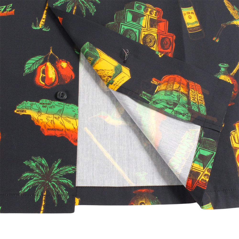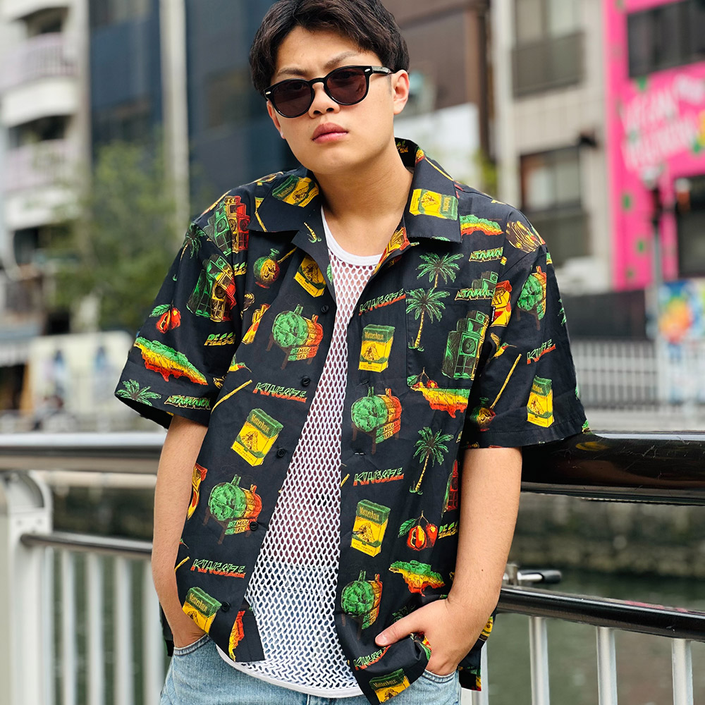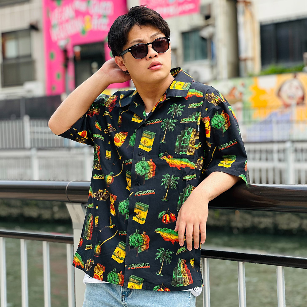 ジャマイカの空気感をそのまま詰め込んだオープンカラーシャツが登場。サウンドシステム、レコード、ジャークパン、タバコパッケージなど、レゲエカルチャーを象徴するアイコンを贅沢に総柄で配しました。素材には肌馴染みの良い綿100%を採用し、サイドスリット入りのボックスシルエットが、リラックス感のある大人のストリートスタイルを演出します。ブランドのバックボーンを存分に感じられる、春夏シーズンにマストな一着です。ブラックボディにラスタなグラフィックスが存在感ある仕上がりで、デニムやチノパンツなど好相性で着回ししやすく、デイリーユースで大活躍するユニセックスでオススメのアイテムです。