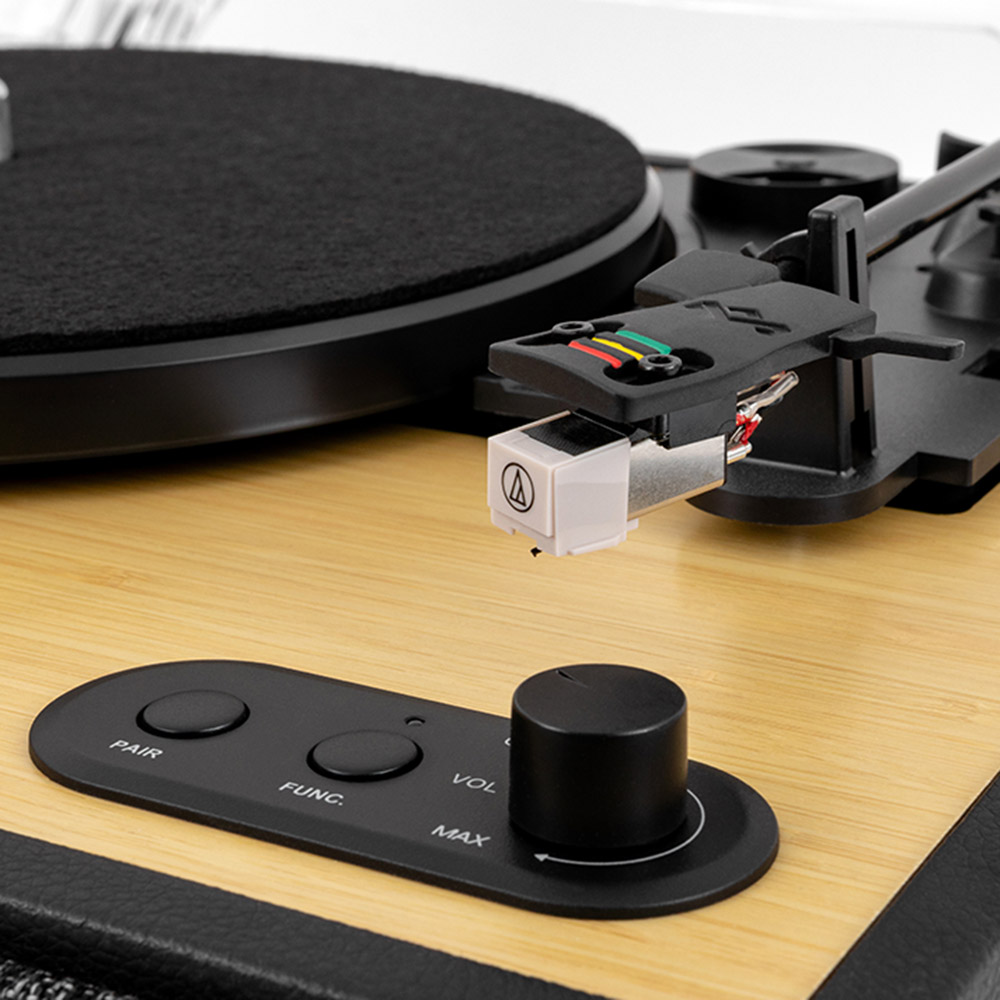 Rise Up Turntableは、レコードの温かみを気軽に楽しめる、スタイリッシュで初めてのレコード体験にも最適なターンテーブルです。本体に内蔵されたステレオスピーカーに加え、デバイスから音楽をストリーミングできるBluetooth®入力、さらに外部スピーカーやヘッドホンへ接続できるBluetooth®出力にも対応。箱から出してすぐに、自分らしいスタイルで音楽を再生できます。あらかじめ調整されたトラッキングフォース、アンチスケート機能、ナチュラルな竹素材の仕上げ、リサイクルフェルト製スリップマットを採用し、サステナブルな素材使いと洗練された現代的なデザインを融合。保護用ダストカバーも備え、使いやすさと愛着の持ちやすさを兼ね備えた一台です。