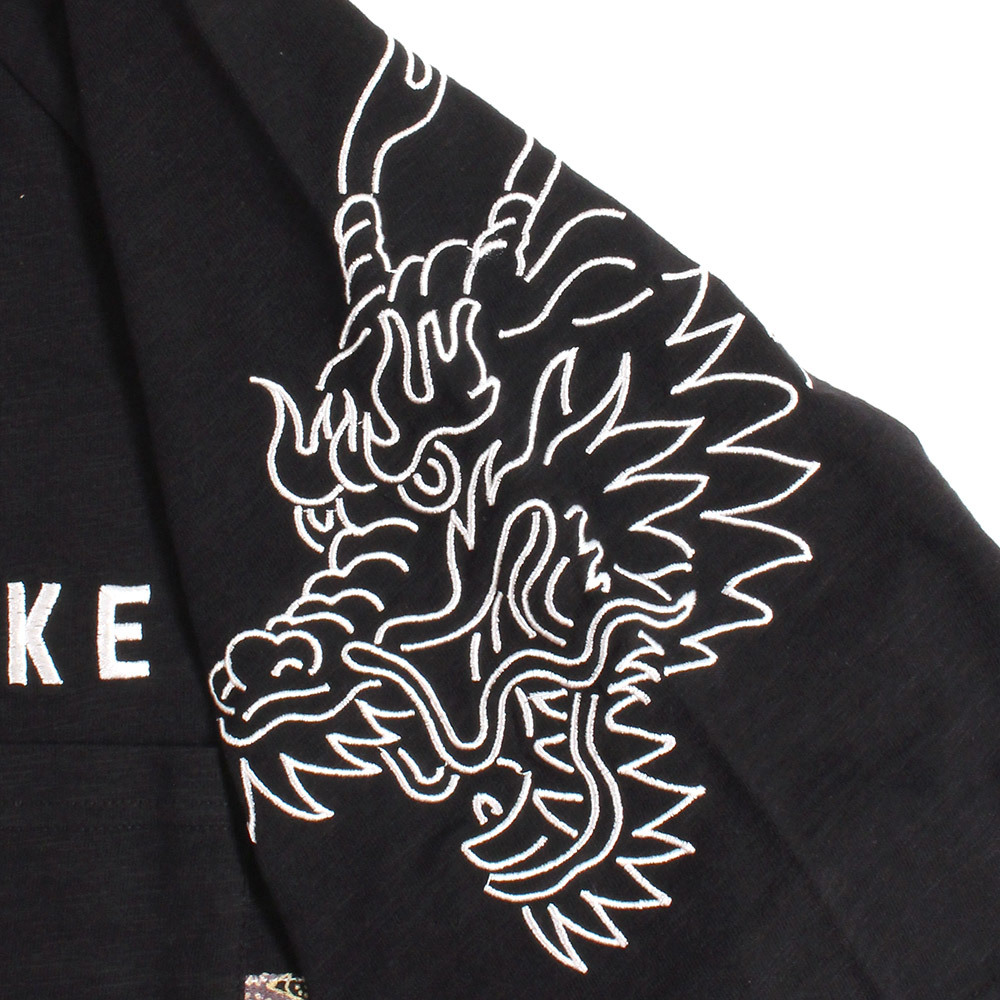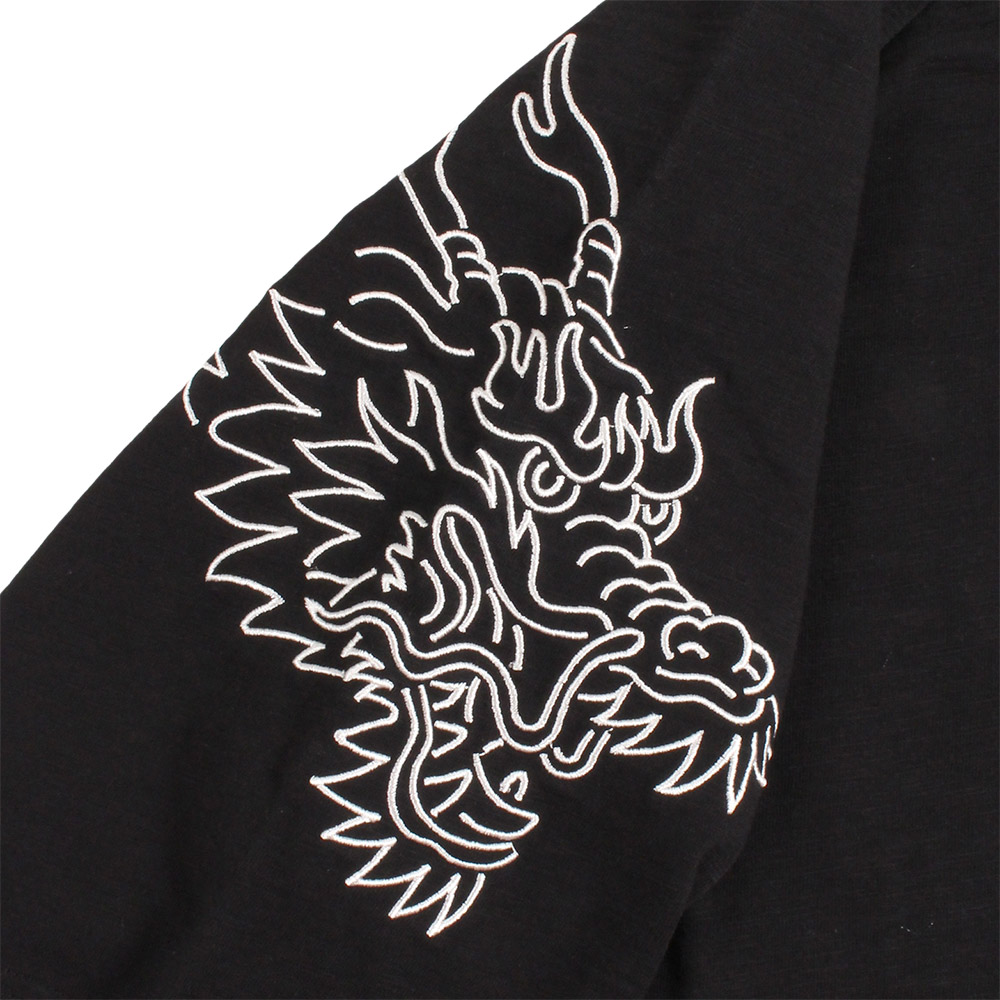 バックに大胆に鎮座するのは、「酒」という文字を和柄の王道「松皮菱(まつかわびし)」のちりめん生地でアップリケ刺繍したインパクト抜群のグラフィック。袖には力強いタッチの龍が刺繍され、ストリートに和の品格をプラスします。和の伝統と現代のストリートスタイルを、酒の香りと共にミックスした「酒」を愛する者の心意気が伝わる、遊び心に満ちた仕上がりです。肌触りの良い生地感にゆったりとしたラグランスリーブのシルエットで、リラックスして着用できるユニセックスでおすすめの一枚。