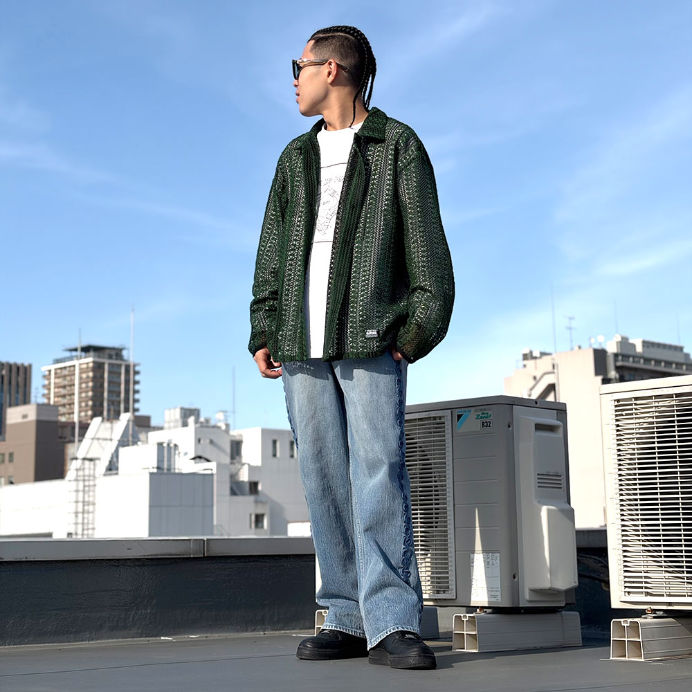 深みのあるグリーンのメッシュシャツがコーデに奥行きをプラスし、シンプルなグラフィックロンTEEで軽さをキープ。